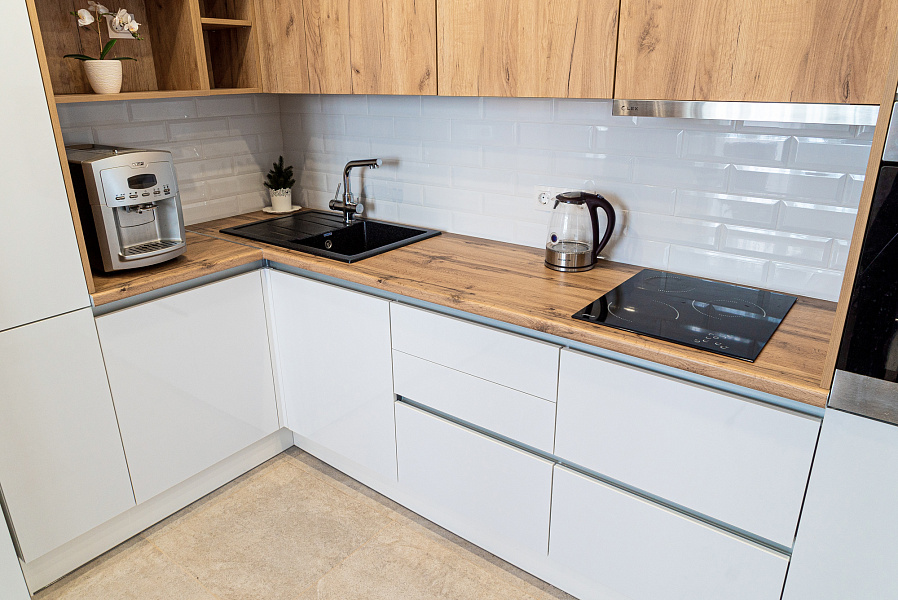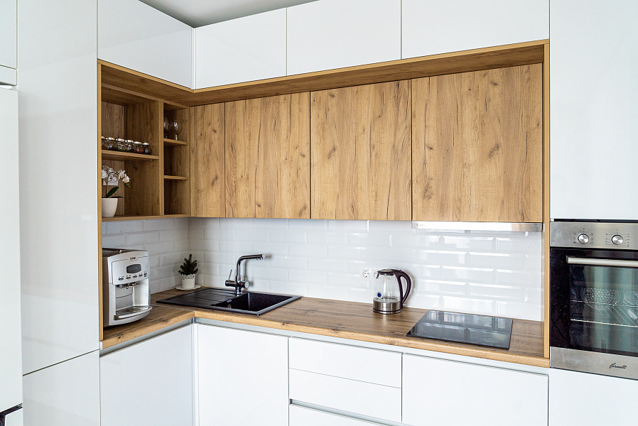 Кухня угловая Hi-Tech — Белый и дуб: детали и особенности